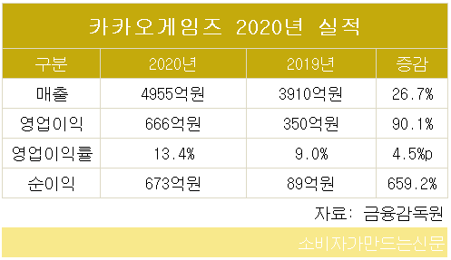 카카오게임즈(각자 대표 남궁훈·조계현)는 연결 기준으로 지난해 연매출 4955억 원, 영업이익 666억 원, 순이익 673억 원을 달성했다고 8일 잠정 공시했다.
