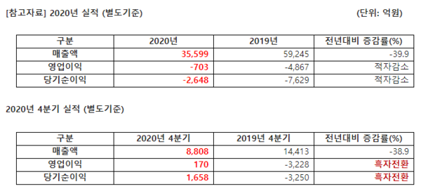 코로나19 영향으로 매출은 전년대비 39.9% 줄었지만 영업손실은 코로나19 여파에도 대폭 감소했다. 특히 4분기 매출액 8808억 원, 영업이익 170억 원을 기록하며 3분기 연속 흑자를 이어갔다.