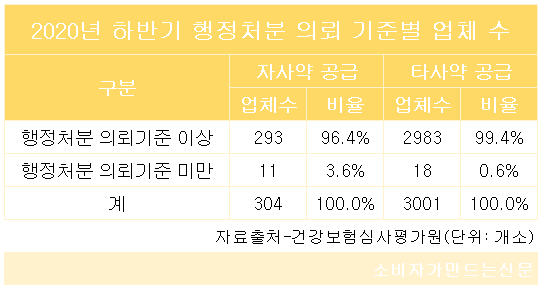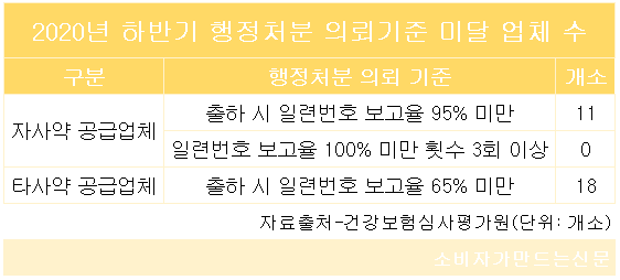 행정처분 의뢰 기준에 미달한 업체는 △자사 허가 의약품 공급업체 11개소 △타사 허가 의약품 공급업체 18개소다.