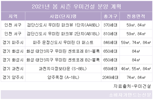 우미건설은 인천 검단을 시작으로 파주 운정, 화성 태안, 경기 과천 등 총 7개 단지 6034가구를 순차적으로 분양할 예정이라고 8일 밝혔다.