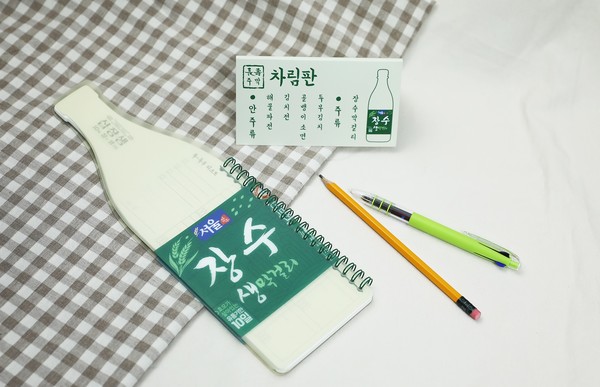 장수막걸리 점착메모지(2000원)는 막걸리를 떠올리게 하는 주막 차림판으로 디자인해 색다른 재미를 준다. 내부 메모지에는 해물파전, 김치전, 골뱅이소면 등 막걸리와 어울리는 안주로 위트있게 디자인 되어 있다.