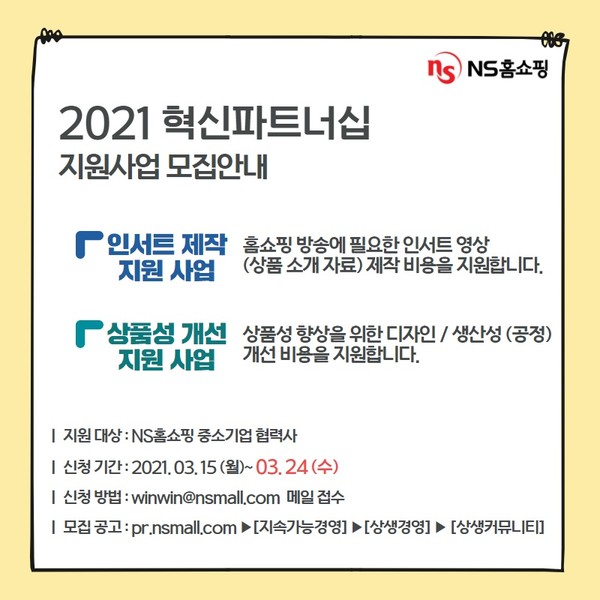 참여 방법은 NS홈쇼핑 기업홈페이지 상생커뮤니티 게시판을 통해 지원양식을 받아 NS홈쇼핑 대표메일(winwin@nsmall.com)을 통해 접수하면 된다.