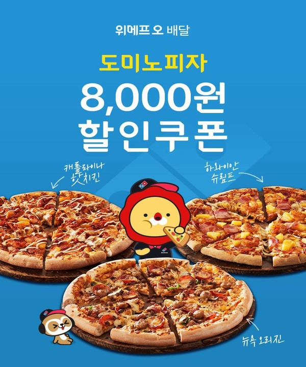 프로모션 기간 위메프오 앱에서 쿠폰을 다운로드 후 ‘바로 결제’로 도미노피자를 주문하면 누구나 8000원 할인 혜택을 받을 수 있다. 쿠폰은 2만1900원 이상 주문 시 ID 당 1회 사용 가능하다.