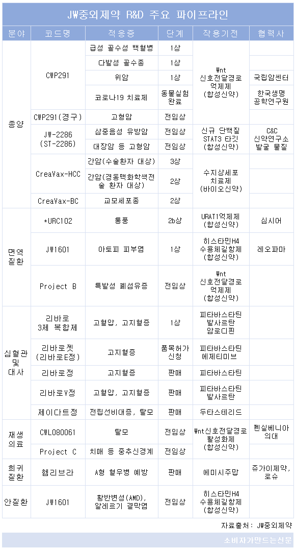 JW중외제약은 앞서 열거한 파이프라인 외에도 종양과 면역질환, 심혈관 및 대사 질환, 재생의료, 희귀질환, 안질환 등에서 다수 신약 후보물질을 보유하고 있다.