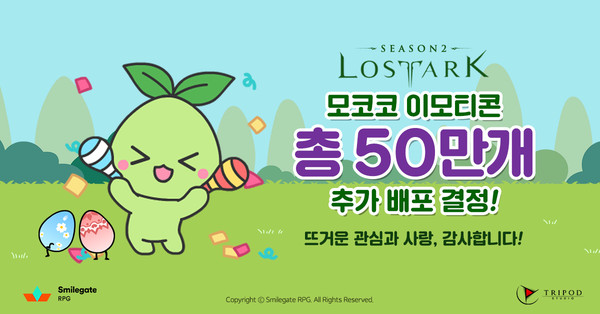 스마일게이트 RPG 지원길 대표는 "로스트아크를 사랑해 주시는 모든 모험가분들의 관심과 성원에 항상 감사드린다. 모코코 이모티콘을 통해 즐겁게 소통할 수 있도록 20만개 추가 배포를 결정하게 됐다. 항상 감사드린다"고 소감을 전했다.