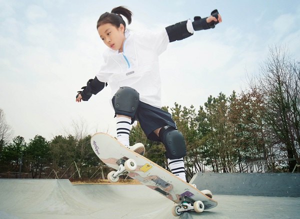 여아용으로 나온 ‘스케이트 스커트 세트’는 크롭 반소매 티셔츠에 스커트와 레깅스가 일체형으로 구성된 제품이다. 스케이트보드 활동시 편안하게 착용할 수 있도록 상의 티셔츠는 코튼 소재로, 하의는 우븐 소재로 제작됐으며, 스커트 안에 레깅스가 일체형으로 구성돼 실용성도 뛰어나다. 컬러는 크림색과 샌드쉘 2가지이며, 가격은 7만9000원이다.