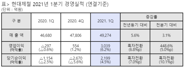 현대제철은 이 같은 실적에 대해 글로벌 철강 시황이 개선되며 판재류 중심으로 제품가격이 인상되고 고부가 제품의 판매가 확대됐기 때문이라고 설명했다. 글로벌 경제가 회복세에 접어들며 선진국과 내수 중심으로 증가한 철강수요에 적극적으로 대응한 결과로 풀이된다.