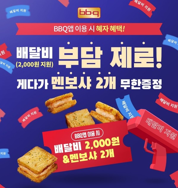 BBQ 자사앱을 통해 배달 주문 시 최종 결제 금액에서 기본 배달료 2000원 할인이 자동으로 적용된다. 여기에 통새우 멘보샤 2개 증정 쿠폰이 추가 제공된다. 배달비 지원과 통새우 멘보샤 증정 혜택은 프로모션 기간 동안 매일 무제한으로 이용 가능하다.