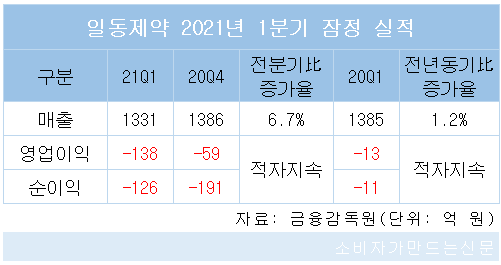 URL복사 기사공유하기 스크랩 프린트 메일보내기 글씨키우기 일동제약(대표 윤웅섭)은 별도 기준 매출 1331억 원과 영업이익 -138억 원, 순이익 -126억 원의 1분기 잠정 실적을 28일 공시했다. 매출은 전분기 대비 6.7% 늘었으며 전년동기 대비로는 1.2% 증가했다. 영업이익과 순이익은 코로나19 여파, 연구개발비 투자 확대 등으로 적자를 지속했다. [소비자가만드는신문=김경애 기자] 저작권자 © 소비자가 만드는 신문 무단전재 및 재배포 금지 김경애 기자 다른기사 보기 URL복사 기사공유하기 주요기사 계약하고 5년 기다린 테슬라 '사이버트럭', 인수일 조정 요청에 취소 라이나생명, 불법 TM영업 논란...통화 도중 '거절'했는데 무단 계약 [K-신약 유망주] HK이노엔 아토피 신약 ‘IN-115314’ 미국 임상 준비 [주간IPO] 1월 넷째주, 덕양에너젠 공모청약…카나프테라퓨틱스 연기할 듯 한화시스템, 매출 4조 돌파· 영업익 2배이상↑'핑크무드'....수출 순풍 카톡 개편으로 '욕'은 먹었지만 수익은 '쑥'....카카오, 역대 최대 전망