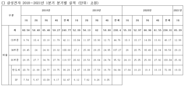 29일 삼성전자는 2021년 1분기 실적 발표를 통해 연결기준 매출 65조 3885억 원, 영업이익 9조3829억 원을 기록했다고 밝혔다. 전년동기대비 매출은 18.2%, 영업이익은 45.5% 증가했다. 전기대비로도 매출과 영업이익이 각각 6.2%, 3.7% 올랐다.