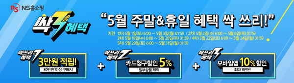 NS홈쇼핑 관계자는 “4월에 진행한 주말 ‘싹쓰리혜택’에 보내주신 큰 성원에 보답하고자 5월에도 기분 좋은 쇼핑을 할 수 있도록 다시 한번 주말 ‘싹쓰리혜택’ 이벤트를 마련했다”며 “NS홈쇼핑이 마련한 특별한 상품들과 혜택으로 즐겁고 건강한 가정의 달 5월을 맞이 하시길 바란다”고 말했다.