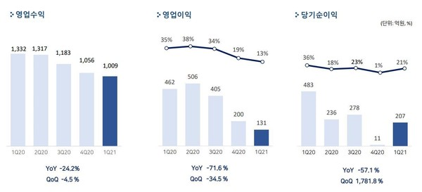 매출은 지난해 1분기보다 24% 감소했고 영업이익과 순이익은 각 72%, 57%가량 감소했다. 전분기 대비로 매출은 4.5%, 영업이익은 34.5% 줄었다.