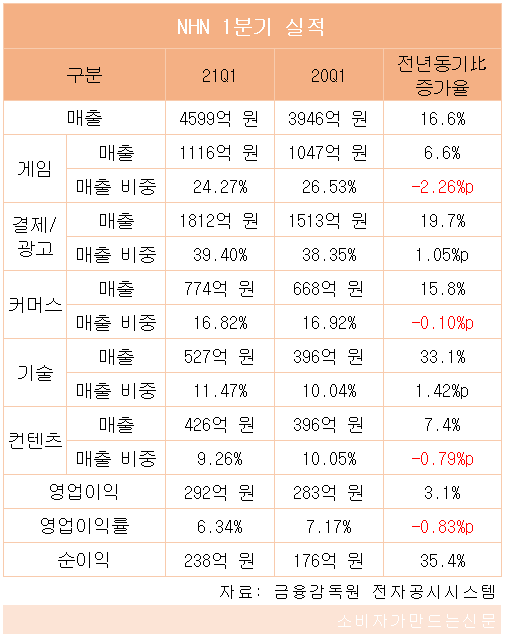 NHN(대표 정우진)은 연결 기준으로 매출 4599억 원과 영업이익 292억 원, 순이익 238억 원의 1분기 실적을 13일 발표했다.