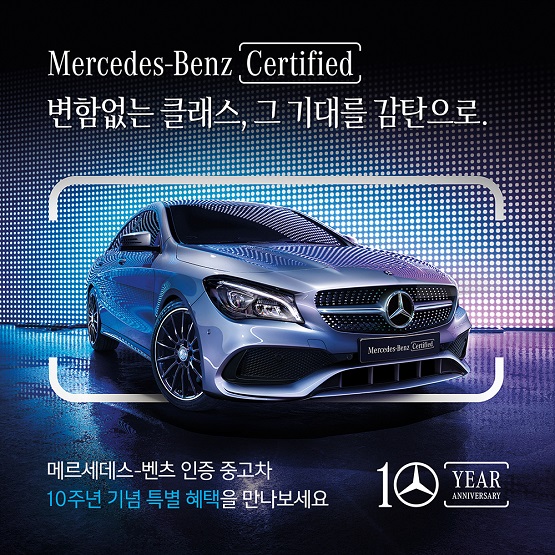 메르세데스-벤츠 코리아는 투명한 중고차 매매 시스템을 정착시키고 중고차 생태계를 활성화하기 위해 지난 2011년 ‘메르세데스-벤츠 인증 중고차(Mercedes-Benz Certified)’ 브랜드를 국내에 공식 출범했으며, 10주년을 기념해 이번 프로모션 캠페인을 마련했다. 캠페인 기간 메르세데스-벤츠 파이낸셜 서비스 코리아의 금융 상품을 이용해 메르세데스-벤츠 인증 중고차를 구매하는 고객은 최저 금리 3.99%대의 혜택과 더불어 기존 1년 또는 2만 km(선도래 기준)의 무상 차량 보증에 1만 km를 추가 받는다.