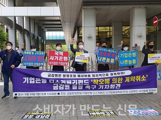 전국사모펀드 사기피해공대위는 24일 금감원 앞에서 기자회견을 열고 금감원 분조위가 디스커버리 펀드 피해 고객들에게 전향적인 분쟁조정 결정을 내려줄 것을 밝혔다.