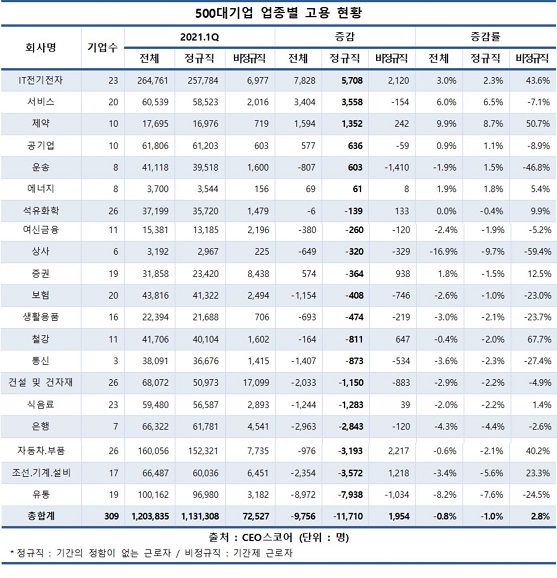 26일 기업평가사이트 CEO스코어(대표 박재권)가 500대 기업 중 직원수를 알 수 있는 309곳의 2019년 4분기 대비 2021년 1분기 기간의 정함이 없는 근로자(정규직)와 기간제 근로자(비정규직) 고용 현황을 조사한 결과, 지난 3월 말 현재 이들 기업의 직원수는 총 120만3835명으로 집계됐다.