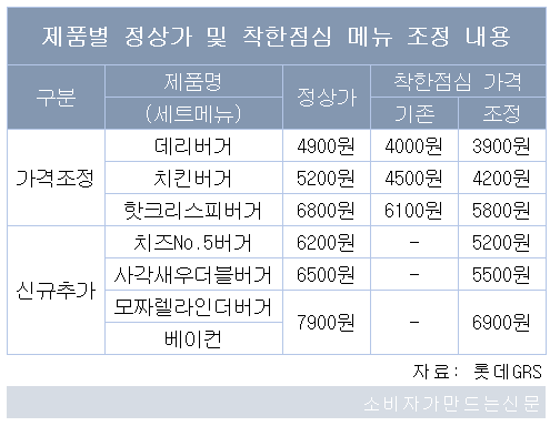 기존 착한점심 메뉴인 데리버거 세트는 4000원에서 3900원으로, 치킨버거 세트는 4500원에서 4200원으로, 핫크리스피버거 세트는 6100원에서 5800원으로 가격이 인하됐다.