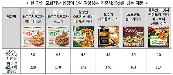평균 포화지방 함량의 경우 청정원 오리지널 콤비네이션 피자, 오뚜기 치즈듬뿍피자, 풀무원 노엣지 꽉찬토핑 피자 페퍼로니 콤비네이션 등 6개 제품은 1일 기준치 15g을 넘겼다.