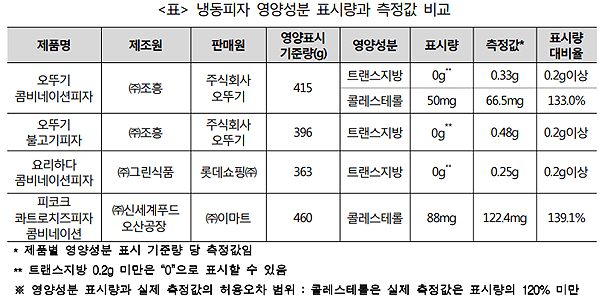 특히 오뚜기 콤비네이션피자와 피코크 콰트로치즈피자 콤비네이션은 실제 콜레스테롤 함량이 허용 오차범위인 '표시량의 120% 미만'을 넘는 것으로 나타났다. 오뚜기 콤비네이션피자는 트랜스지방과 콜레스테롤 함량 모두 표시기준의 허용오차범위를 초과했다.