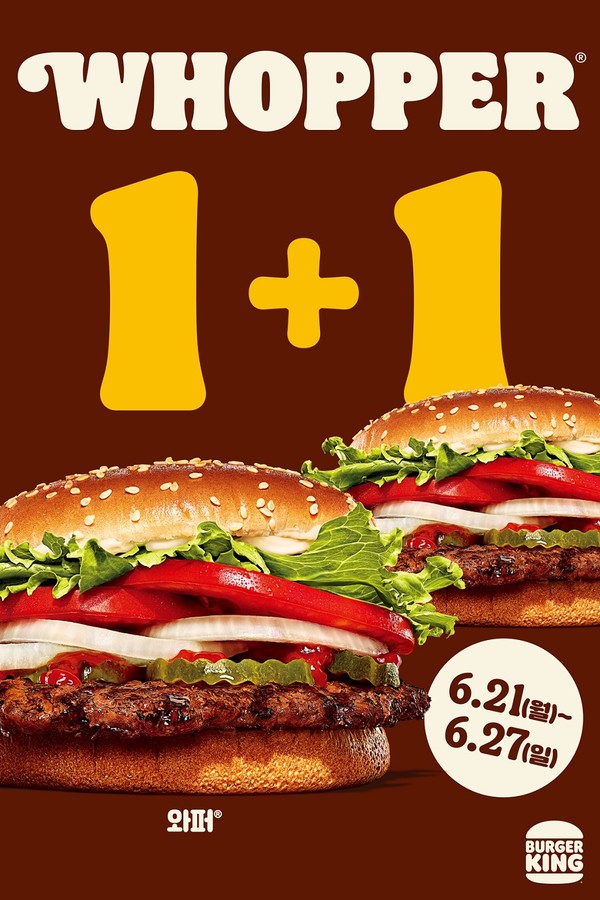 햄버거 브랜드 버거킹은 오는 27일까지 와퍼 및 치즈와퍼 단품 구매 시 동일 메뉴 1개를 추가로 증정하는 '1+1 프로모션'을 실시한다고 21일 밝혔다.