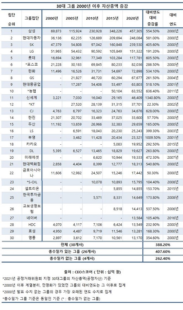 27일 기업평가사이트 CEO스코어(대표 박재권)가 국내 30대 그룹의 2000년부터 지난해까지 20년간 자산 성장률을 조사한 결과, 오너가 있는 26곳의 자산은 평균 407.6% 늘어난 반면, 오너가 없는 4곳은 같은 기간 자산이 262.4% 증가하는 데 그쳤다.