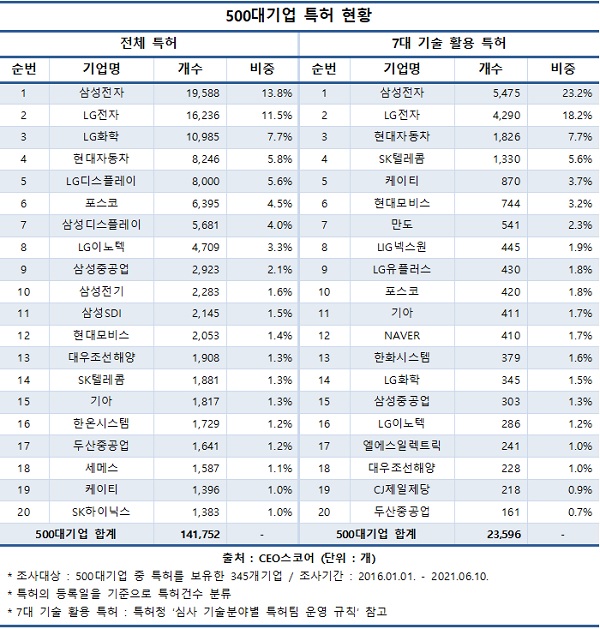 LG전자(4290개, 18.2%)와 현대차(1826개, 7.7%), SK텔레콤(1330개, 5.6%) 등도 각각 1000개 이상의 7대 핵심기술 활용 특허를 등록하며 미래사업 투자에 힘쓴 것으로 나타났다.