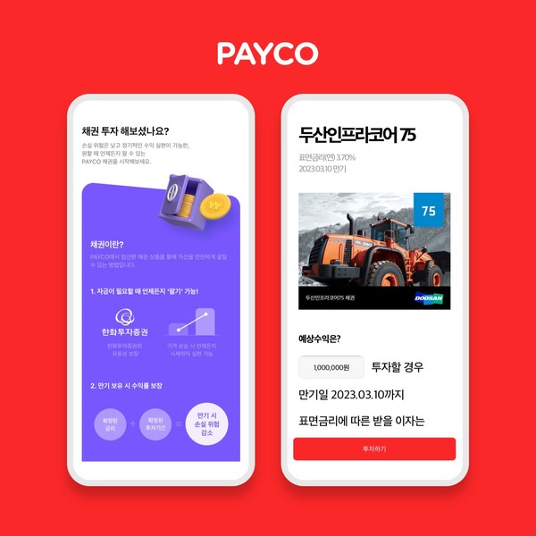 NHN페이코가 한화투자증권과 손 잡고 선보인 채권 상품은 '두산인프라코어'와 '풀무원식품'의 회사채 상품으로 저금리 시대에 매력적인 금리를 제공하는 것이 특징이라는 설명이다.