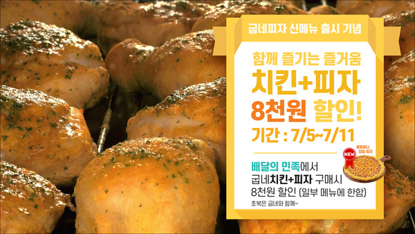 7월 5일부터 7월 11일까지 배달의민족에서 굽네피자 신메뉴 2종(페퍼로니 찹찹 피자, 시카고 딥디쉬 피자)과 굽네치킨 4종(고추바사삭, 갈릭마왕, 볼케이노, 갈비천왕)을 함께 구입하는 고객을 대상으로 8000원 할인 혜택을 제공한다.