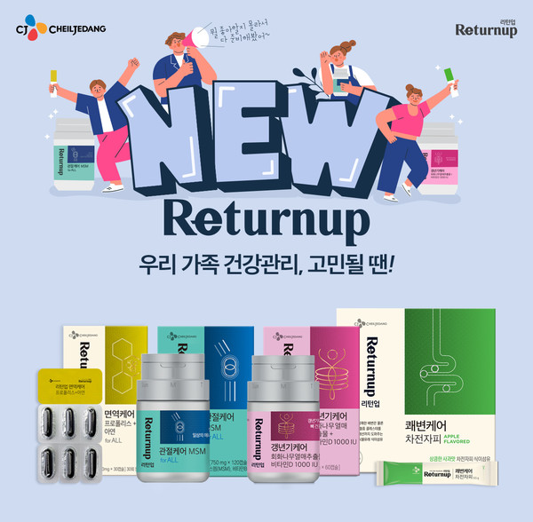 CJ제일제당은 ▲리턴업 면역케어 프로폴리스+아연 ▲리턴업 갱년기케어 회화나무 열매추출물+비타민D1000IU ▲리턴업 관절케어 MSM ▲리턴업 쾌변케어 차전자피 등 리턴업 신제품 4종을 출시했다고 6일 밝혔다.