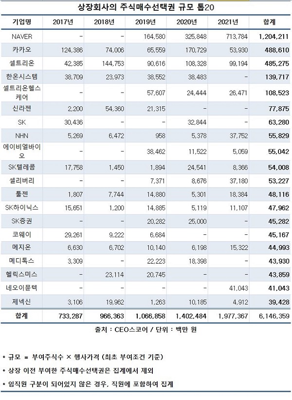 기업별로는 네이버가 5년간 총 1조2042억 원의 스톡옵션을 부여해 조사대상 내 유일하게 조단위 스톡옵션 규모를 나타냈다. 네이버는 2019년 1646억 원에 이어 △2020년 3258억 원 △2021년 7138억 원 등의 스톡옵션을 지급, 3년 연속 1위를 기록했다.