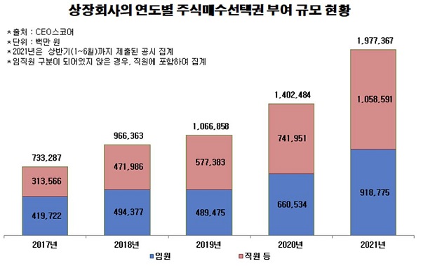 7일 기업평가사이트 CEO스코어(대표 박재권)가 국내 상장사의 스톡옵션 부여 현황을 조사한 결과 올 상반기에만 1조9774억 원으로 확인됐다.