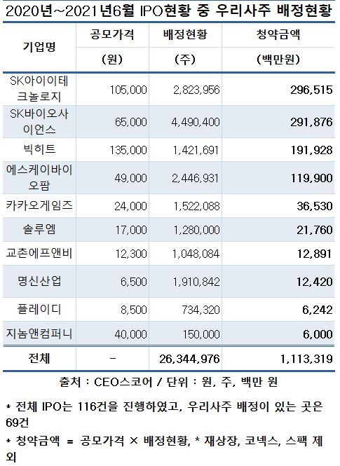 한편 지난해부터 올 상반기까지의 상장 기업수는 116개로, 기업공개(IPO) 이전 우리사주를 배정한 곳은 69곳(59.5%)으로 조사됐다. 조사 기간 69개 기업이 우리사주로 배정한 주식은 총 2634만4976주로, 청약 금액은 1조1133억 원으로 집계됐다.