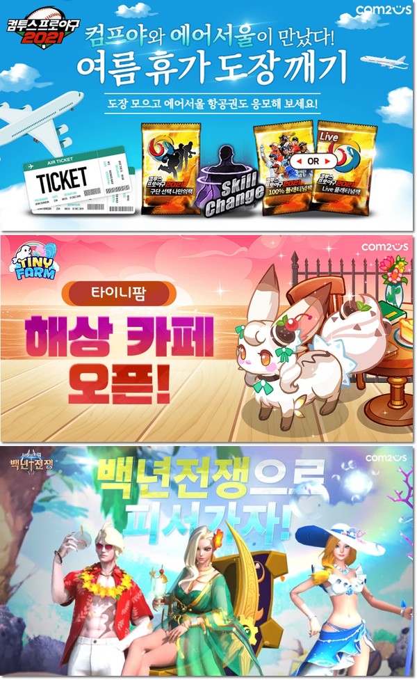 이번 여름 이벤트는 다양한 여름 콘텐츠를 추가한 ‘서머너즈 워: 백년전쟁’(이하 백년전쟁), KBO기반의 모바일 야구 게임 ‘컴투스프로야구2021(이하 컴프야), 인기 모바일 SNG ‘타이니팜’ 등 다양한 게임에서 진행된다.