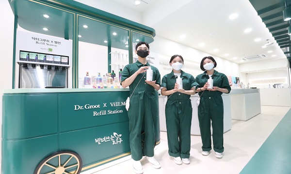 리필 스테이션을 활용하면 제품의 내용물을 원하는 만큼 소분해 구매할 수 있어 플라스틱 사용량을 최소화할 수 있다. 또한, 리필 스테이션에서 활용되는 용기는 코코넛 껍질을 사용, 플라스틱 사용량을 약 30% 절감했고, 재활용이 가능하다. 라벨 또한 재활용 과정에서 물에 쉽게 분리되는 ‘수(水) 분리 라벨’을 적용해서 분리배출이 용이하다는 게 회사 측 설명이다.