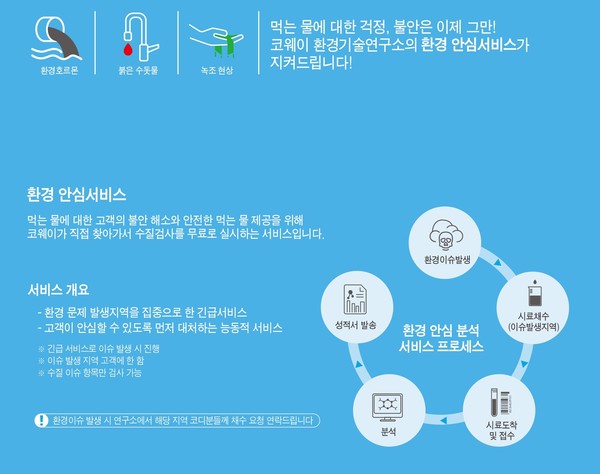 코웨이 관계자는 "환경 가전 선도 기업으로서 어떠한 상황에서도 고객이 걱정 없이 안심하고 깨끗한 물을 마실 수 있도록 지원하고자 환경 안심서비스를 시행하게 됐다”며 “코웨이는 국내 최고 수준의 수질 분석 능력을 바탕으로 고객이 언제나 믿고 마실 수 있는 물을 제공하기 위해 최선을 다하겠다”고 말했다.