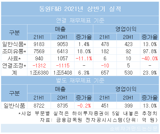 동원F&B 사업 부문은 크게 일반식품과 조미유통, 사료로 구분된다. 매출 비중이 가장 큰 일반식품은 동원F&B, 조미유통은 자회사인 동원홈푸드, 사료는 동원팜스가 맡고 있다.
