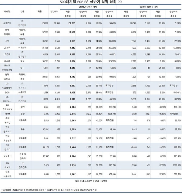 영업손익에서도 IT전기전자와 중후장대 업종 기업들이 강세를 보였다. 증가폭 1위는 삼성전자로 지난해 상반기 14조5936억 원에서 올해 상반기 21조9496억 원으로 1년 새 7조3560억 원(50.4%) 늘었다. 이어 포스코(2조8801억 원·329.9%↑), LG화학(2조7705억 원·356.3%↑), 에쓰오일(2조3718억 원↑·흑자전환), HMM(2조2715억 원·1661.7%↑) 순이었다.