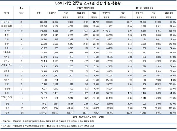 18일 기업평가사이트 CEO스코어(대표 박재권)가 국내 500대 기업 중 지난 17일까지 올해 반기보고서를 제출한 255개 기업을 대상으로 2019년부터 올해까지 연도별 상반기 실적을 조사한 결과, 이들 기업의 상반기 매출은 지난해 1020조9783억 원에서 올해 1127조4212억 원으로 10.4%(106조4430억 원) 증가했다. 특히 영업이익은 같은 기간 51조6145억 원에서 105조1318억 원으로 103.7%(53조5174억 원) 늘었다. 지난해 코로나19로 급격히 위축됐던 업황이 완연한 회복세를 맞은 것으로 분석된다.