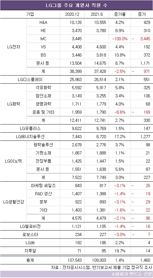 금융감독원 전자공시시스템에 따르면 반기보고서를 제출하는 LG그룹 11개 계열사의 정규직 직원 수는 10만9003명으로 지난해 말 10만7543명에서 1.4% 증가했다.
