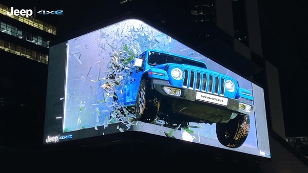 이 기법을 활용해, 영상 내 효과 요소인 물과 돌이 화면 밖으로 튈 것 같은 착각을 불러일으키고, 랭글러 4xe 모델이 가로 약 81m, 세로 약 20m 크기의 국내 최대 규모의 거대 옥외 디지털 사이니지를 부수고 뛰쳐나오는 듯한 압도적인 몰입감을 자랑한다.