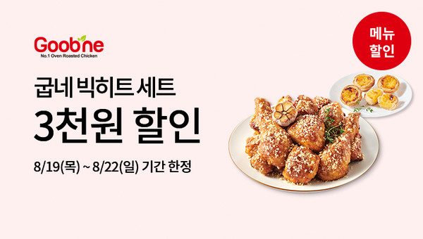굽네 빅히트 세트는 굽네치킨과 굽네피자, 디저트 사이드 신메뉴로 구성됐다. 할인 대상 메뉴는 △굽네 갈릭마왕+에그미니 타르트 △굽네 갈릭마왕 반반+에그미니 타르트 △굽네 페퍼로니 피자+에그미니 타르트 △굽네 갈릭마왕+페퍼로니 피자+에그미니 타르트 총 네 가지다. 오는 22일까지 4일간 해당 세트 구매 시 3000원을 할인받을 수 있다.