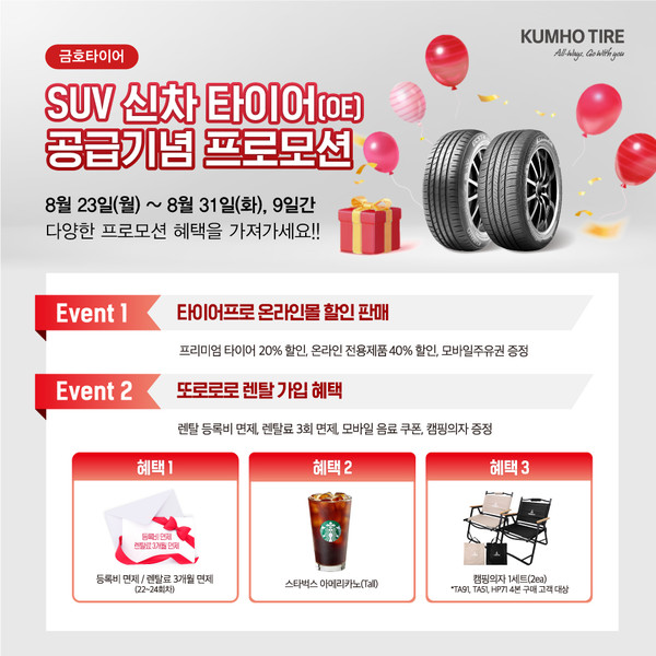 이번 프로모션은 이를 기념, 타이어프로 온라인몰과 또로로로 렌탈서비스에서 진행하며, 타이어 할인 판매, 서비스 렌탈료 면제 및 사은품 증정을 진행한다.