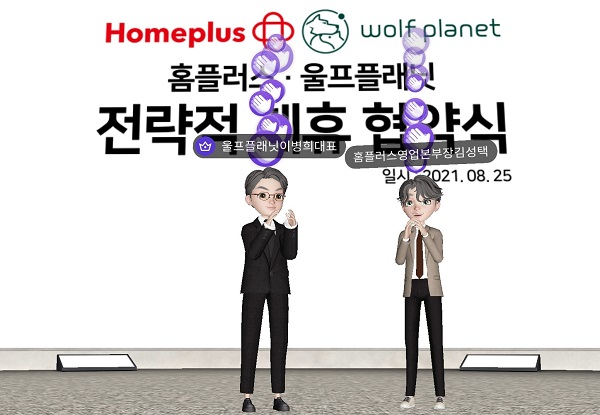 이번 협약식은 사회적 거리두기 4단계 상황을 고려해 메타버스 플랫폼의 가상공간에서 진행했다. 김성택 홈플러스 영업본부장과 이병희 울프플래닛 대표는 가상공간에 각자의 모습을 본떠 만든 아바타로 참석해 눈길을 끌었다.