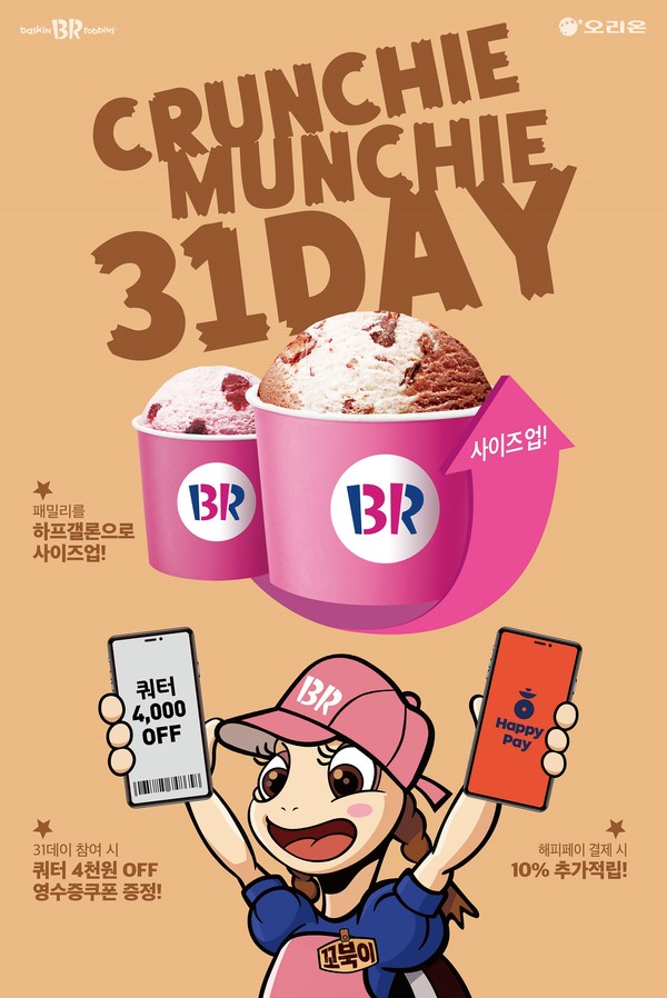 배스킨라빈스의 '31데이'는 31일 단 하루 배스킨라빈스 매장에서 패밀리(2만2000원) 구매 시 하프갤론(2만6500원)으로 사이즈 업그레이드 혜택을 선사하는 행사다.