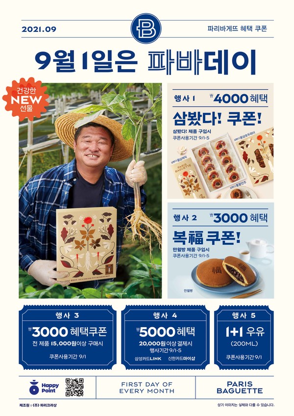 파바데이에는 매월 새롭게 출시되는 신제품 혜택 쿠폰도 제공한다. 9월에는 추석 선물을 테마로 △풍기 인삼 농가를 돕는 취지에서 6년근 풍기 인삼으로 만든 홍삼 절편을 사용해 출시한 '삼봤다 추석선물' 3종(4000원 할인 혜택) △보름달(滿月)을 보며 가족의 건강과 복을 기원하는 의미를 담은 '만월빵'(3000원 할인 혜택) 쿠폰을 제공한다.