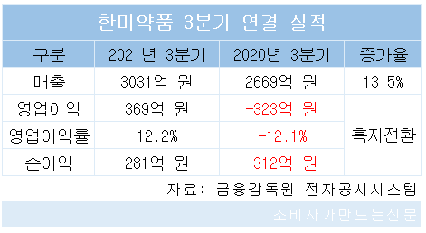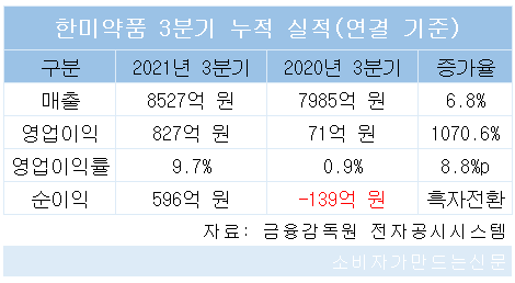 한미약품 측은 "작년 3분기는 사노피와의 파트너십 계약 종료로 양사 공동연구비 잔액을 일괄 정산하면서 일시적으로 적자가 발생했으나 이후 효율적 경영 관리가 가능해지면서 매분기 안정적 실적을 지속해왔다. 올 3분기에는 국내외 매출 호조가 더해져 완벽한 턴어라운드를 실현했다"고 말했다.