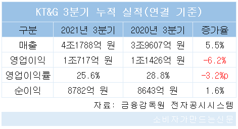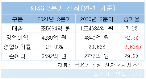 KT&G는 연결 기준으로 매출 1조5684억 원과 영업이익 4239억 원, 순이익 3592억 원의 3분기 잠정 실적을 4일 공시했다.