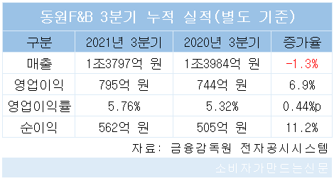 동원F&B는 별도 기준으로 매출 1조3797억 원과 영업이익 795억 원, 순이익 562억 원의 3분기 누적 실적을 발표했다.