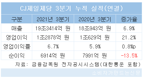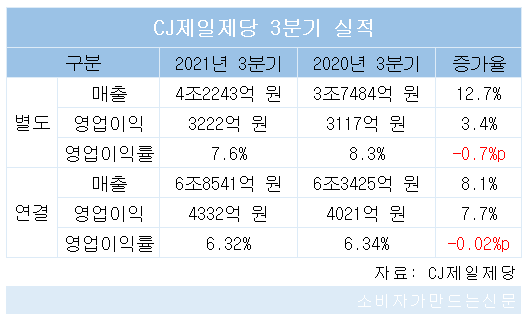 3분기 별도 영업이익은 3222억 원으로 지난해 3분기보다 3.4% 성장했다. 이에 따른 영업이익률은 7.6%다. 회사 측은 "양대 축인 식품과 바이오 사업 글로벌 실적 호조가 3분기 성장을 견인했다"고 말했다.