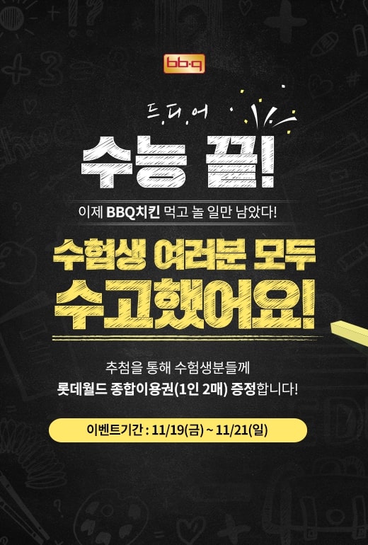 한편 BBQ는 수능 수험생을 위한 롯데월드 종합이용권 증정 프로모션을 진행 중이다. BBQ 공식 인스타그램을 통해 오는 19일부터 사흘간 진행된다.